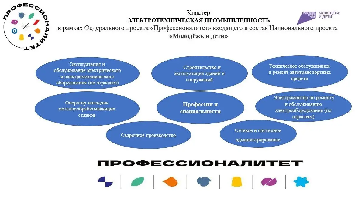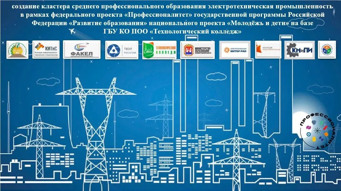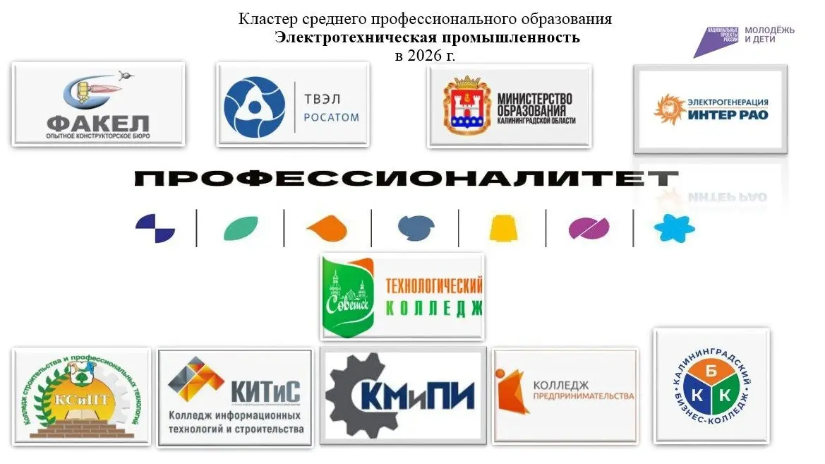 Профессиональные образовательные организации, входящие в кластер среднего профессионального образования электротехнической промышленности активные участники всех процессов, присущих среднему профессиональному образованию региона. Мобильно внедряющие в подготовку новые профессии и специальности экономической отрасли электротехнической промышленности Калининградской области, а также подготовку кадров по наиболее перспективным и востребованным на рынке труда профессиям и специальностям, требующим среднего профессионального образования. На базе данных организаций открыты ресурсные центры, аккредитованные площадки проведения демонстрационных экзаменов и чемпионатов «Профессионалы».